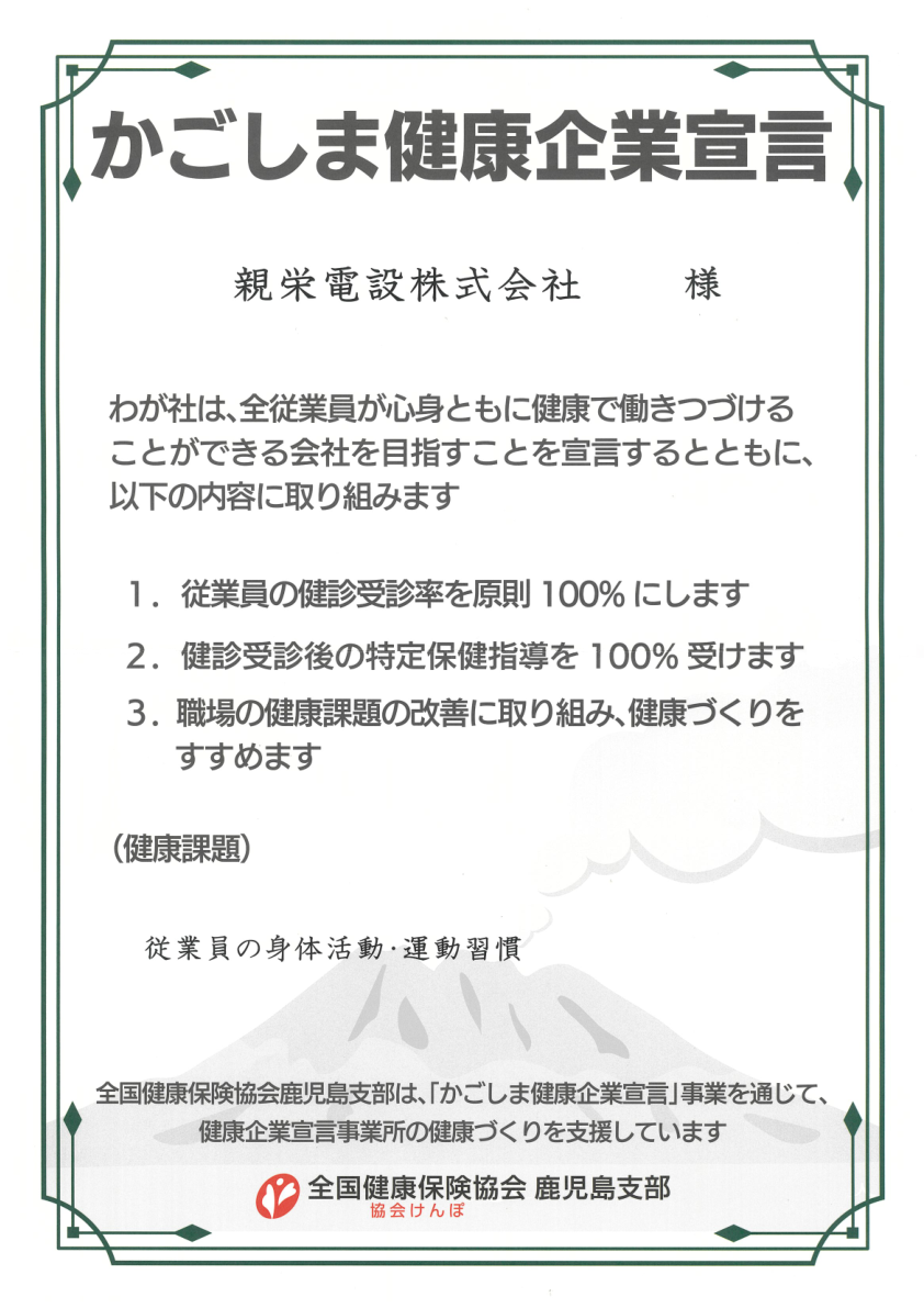 当社は、「かごしま健康企業宣言」に登録し、社員一人ひとりが心身ともに健やかに働ける職場づくりに取り組んでいます。